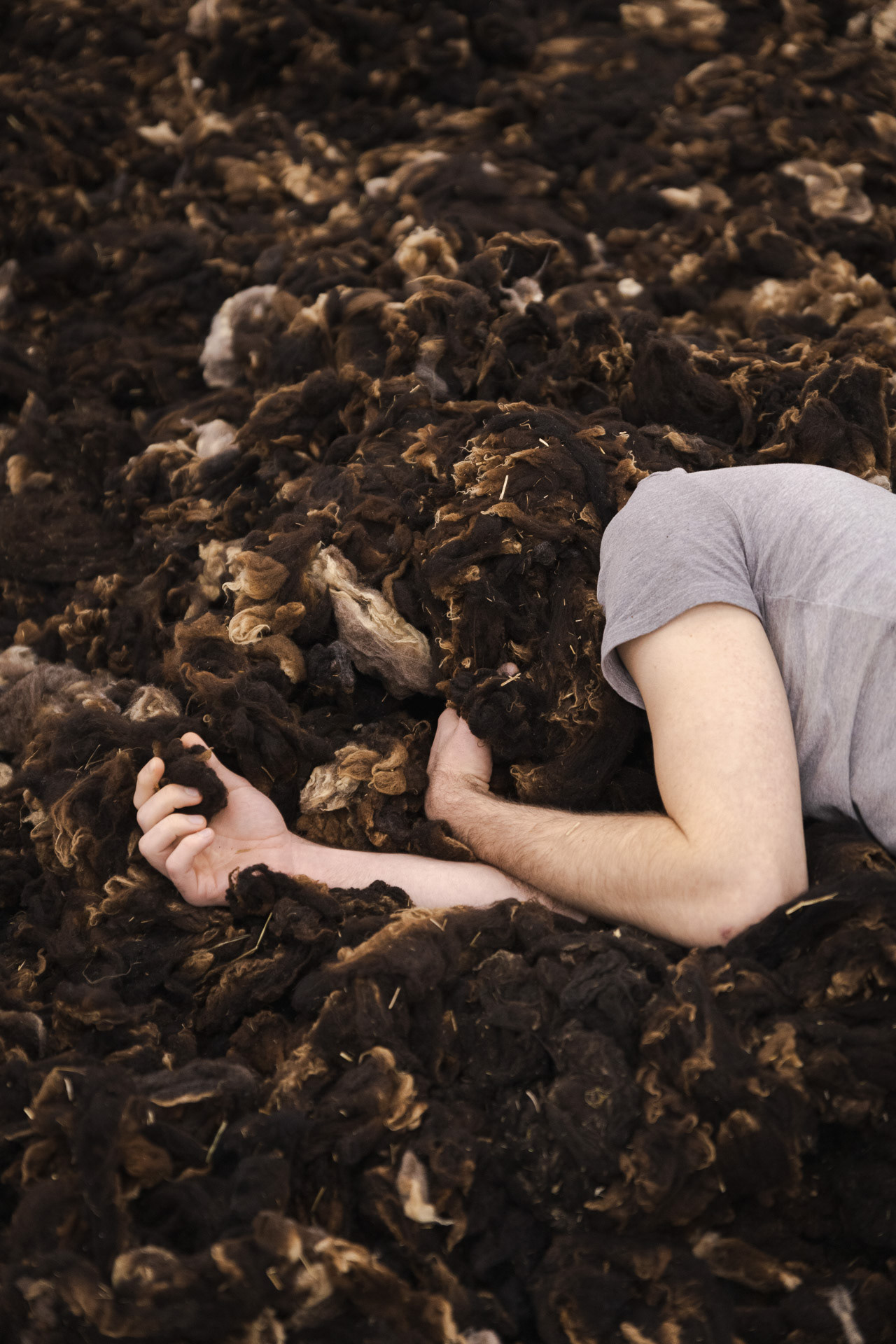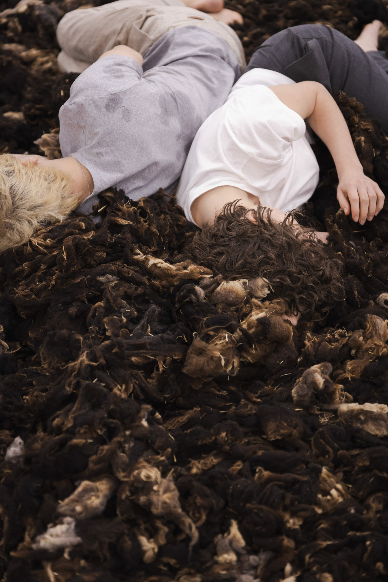 Caroline’s work features a large-scale floor piece made of raw sheep’s wool and water, which is released with every movement by the performers Lenz Farkas and Maite Dárdano.